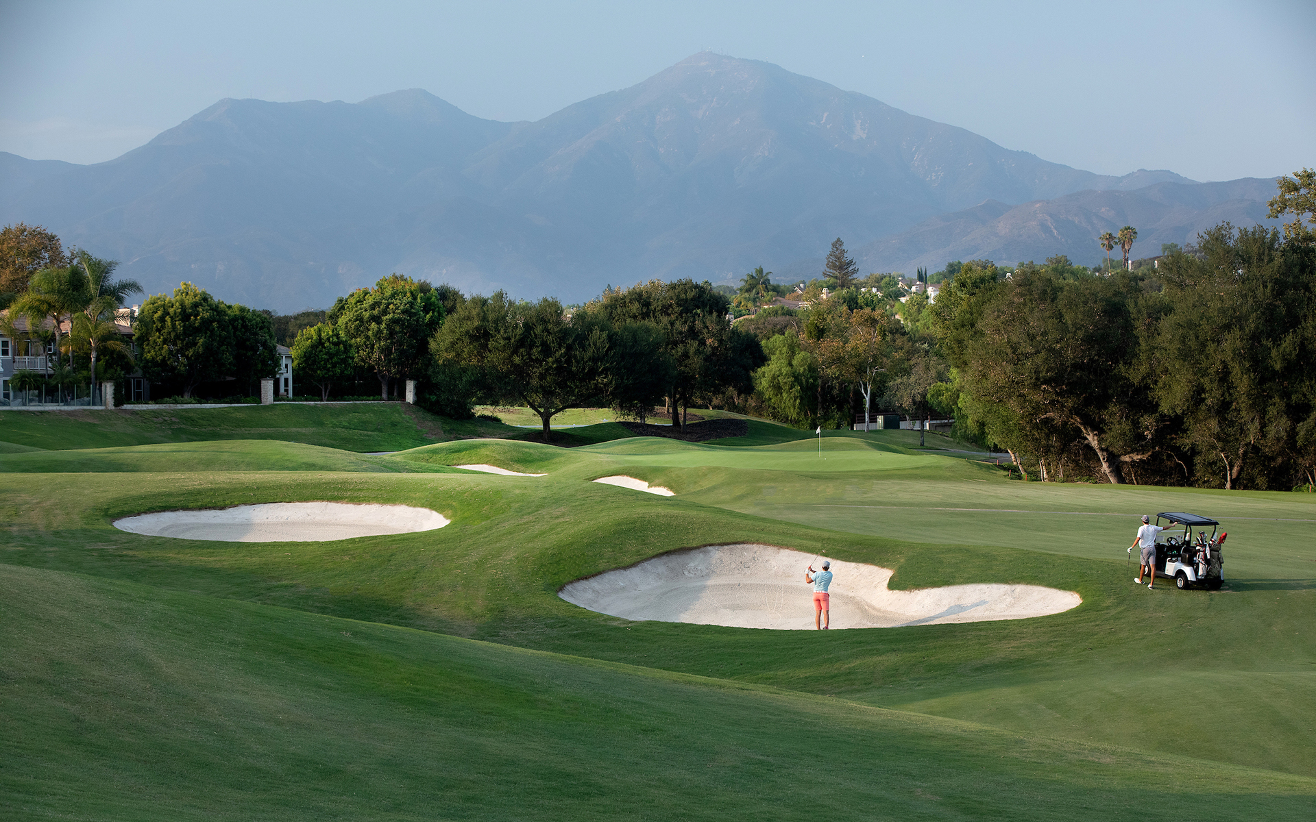 The course opens with its signature 601-yard par 5, which is considered one of the best starting holes in southern California. A 170-yard carry is required off the tee to clear a ravine followed by a lay-up second shot that must avoid the seven bunkers guarding the left side of the fairway. The green on this hole is narrow, so a premium is placed on distance control on the approach.